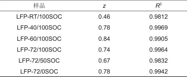 擬合結(jié)果如圖3所示,除室溫滿電存儲(chǔ)的樣品(LFP-RT/100SOC)外,其他磷酸鐵鋰電池樣品線性擬合曲線近似平行,即斜率z值近乎相同。表2擬合結(jié)果顯示,LFP-RT/100SOC電池樣品的z值為0.46(z≈0.5),這說(shuō)明在室溫條件下,滿電LFP電池在存儲(chǔ)過(guò)程中其性能衰減可能主要是源于SEI膜的自然生長(zhǎng)過(guò)程,即石墨陽(yáng)極表面嵌鋰與電解液之間的副反應(yīng);而在其他工況條件下,z值均明顯大于0.5(0.67≤z≤0.84),這表明在這些工況下電池性能衰減機(jī)制可能更為復(fù)雜。