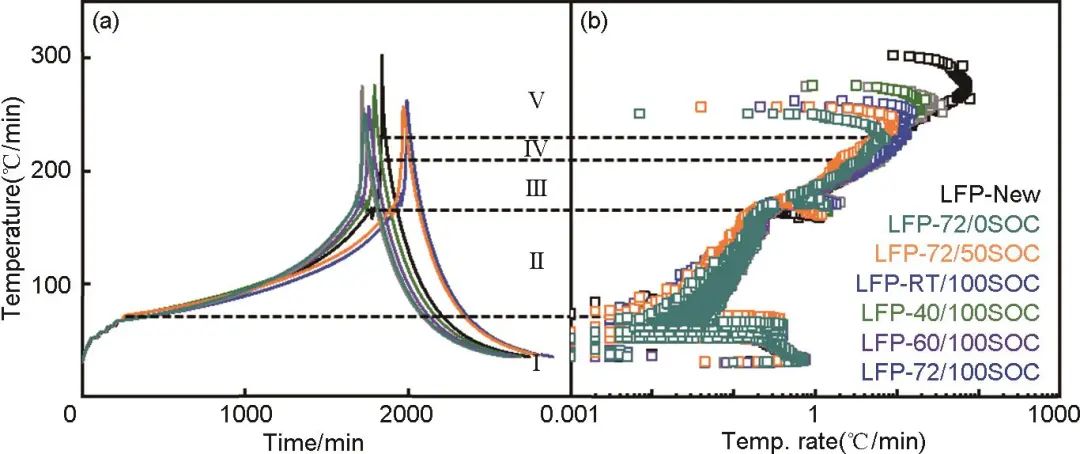 進(jìn)一步對(duì)磷酸鐵鋰電池單體的熱安全性進(jìn)行了研究,在絕熱環(huán)境中通過(guò)設(shè)備加熱來(lái)引發(fā)電池自發(fā)熱并最終觸發(fā)電池?zé)崾Э?。結(jié)果如圖5所示,新鮮電池樣品LFP-New的熱失控反應(yīng)表現(xiàn)最為劇烈,其熱失控最高溫度TMAX最大,達(dá)302.6 ℃,熱失控最大溫升速率(dT/dt)MAX最高,達(dá)79 ℃/min;然而,經(jīng)過(guò)不同條件存儲(chǔ)之后,該型磷酸鐵鋰電池的熱安全性均有不同程度的提升,體現(xiàn)在其主要熱失控特性參數(shù)TMAX和(dT/dt)MAX均有所下降。圖5(b)顯示磷酸鐵鋰電池?zé)崾Э販厣俾蔬^(guò)程表現(xiàn)出明顯的分階段特征,本工作中將電池?zé)崾Э貏澐譃?個(gè)階段,其中:階段I為“加熱-等待-搜尋”階段,此過(guò)程中儀器腔內(nèi)溫度呈階梯式上升,為電池提供熱量;階段II為電池自加熱階段(自加熱至泄壓閥打開(kāi));階段III為電池快速自加熱階段;階段IV為電池?zé)崾Э仉A段;階段V為熱失控結(jié)束降溫階段。