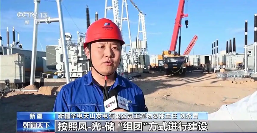 新疆華電天山發(fā)電有限公司工程物資部主任 劉永青:項(xiàng)目采用風(fēng)光同場(chǎng)布置,按風(fēng)-光-儲(chǔ)“組團(tuán)”方式建設(shè),同步建設(shè)8座220KV匯集站,是國(guó)內(nèi)首個(gè)“風(fēng)光火儲(chǔ)”一體化運(yùn)行控制新能源項(xiàng)目。
