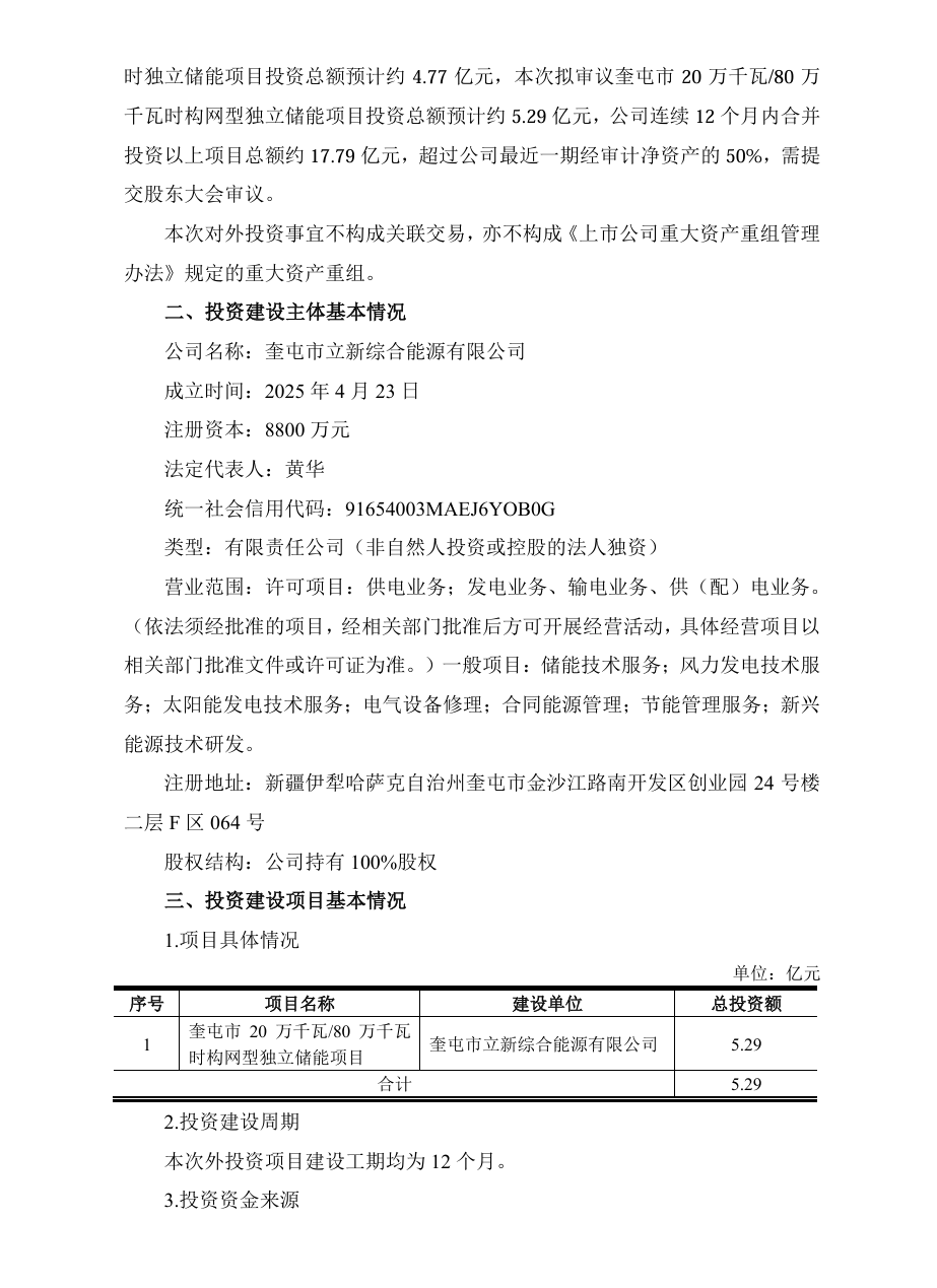 此前,公司于6月3日分別審議通過(guò)了公司《關(guān)于投資建設(shè)和田市立新100兆瓦/400兆瓦時(shí)獨(dú)立儲(chǔ)能項(xiàng)目的議案》《關(guān)于投資建設(shè)民豐縣立新200兆瓦/800兆瓦時(shí)獨(dú)立儲(chǔ)能項(xiàng)目的議案》《關(guān)于投資建設(shè)皮山縣立新二期200兆瓦/800兆瓦時(shí)獨(dú)立儲(chǔ)能項(xiàng)目的議案》,其中立新和田市100兆瓦/400 兆瓦時(shí)獨(dú)立儲(chǔ)能項(xiàng)目投資總額預(yù)計(jì)約2.58億元,立新民豐縣200兆瓦/800兆瓦時(shí)獨(dú)立儲(chǔ)能項(xiàng)目投資總額預(yù)計(jì)約5.15億元,立新皮山縣二期200兆瓦/800兆瓦時(shí)獨(dú)立儲(chǔ)能項(xiàng)目投資總額預(yù)計(jì)約4.77億元。算上此次奎屯市20萬(wàn)千瓦/80萬(wàn)千瓦時(shí)構(gòu)網(wǎng)型獨(dú)立儲(chǔ)能項(xiàng)目,公司連續(xù)12個(gè)月內(nèi)合并投資以上項(xiàng)目總額約17.79億元。