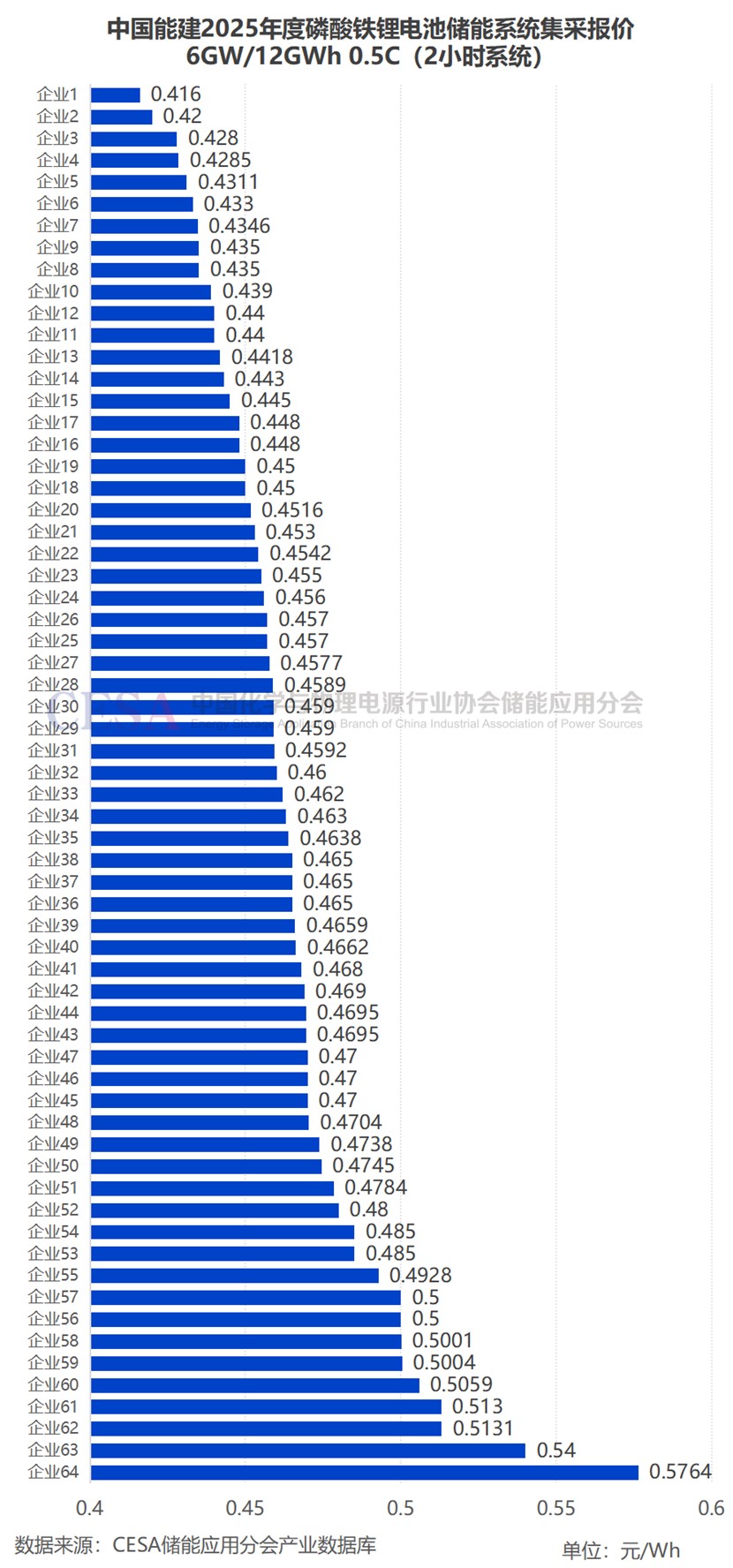 本次集采預(yù)估總量25GWh,分為3個(gè)標(biāo)段,吸引了超70家企業(yè)競(jìng)逐,其中,4h儲(chǔ)能系統(tǒng)平均報(bào)價(jià)0.4249元/Wh,2h儲(chǔ)能系統(tǒng)平均報(bào)價(jià)0.4646元/Wh,1h儲(chǔ)能系統(tǒng)平均報(bào)價(jià)0.7863元/Wh。