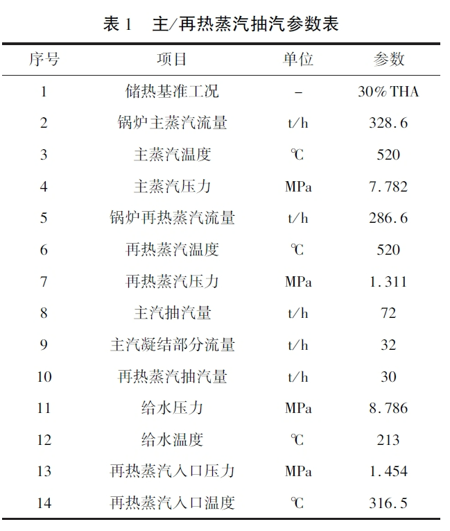 本系統(tǒng)方案儲(chǔ)熱基準(zhǔn)工況設(shè)定為30%THA,根據(jù)汽機(jī)熱平衡圖,30%THA負(fù)荷主汽參數(shù)為520℃/7.782MPa,再熱蒸汽參數(shù)為520℃/1.454MPa。根據(jù)系統(tǒng)方案抽汽蓄能調(diào)峰區(qū)間為30%~24.%THA,為滿足調(diào)峰要求,同時(shí)抽取主、再熱蒸汽,經(jīng)過核算主汽抽汽量為72t/h,其中32t/h蒸汽用于釋放顯熱和潛熱加熱熔鹽冷凝為水,經(jīng)過循環(huán)泵加壓與給水參數(shù)匹配,剩余40t/h主汽只通過釋放顯熱加熱熔鹽,換熱后的蒸汽參數(shù)經(jīng)過減溫減壓與冷段參數(shù)進(jìn)行匹配。