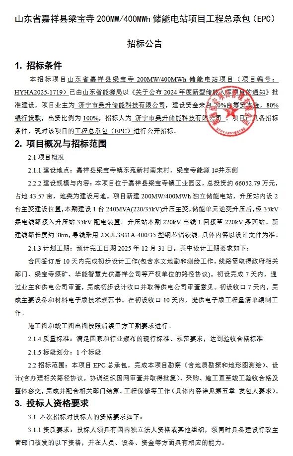中國儲(chǔ)能網(wǎng)訊:6月25日,濟(jì)寧市昊升儲(chǔ)能科技有限公司發(fā)布山東省嘉祥縣梁寶寺200MW/400MWh儲(chǔ)能電站項(xiàng)目工程總承包(EPC)招標(biāo)公告。項(xiàng)目位于山東省濟(jì)寧市嘉祥縣,項(xiàng)目新建 200MW/400MWh獨(dú)立儲(chǔ)能電站,升壓站內(nèi)設(shè)2臺(tái)主變建設(shè)位置,本期建設(shè)1臺(tái)240MVA(220/35kV)升壓主變,儲(chǔ)能單元逆變升壓后,經(jīng) 35kV集電線路接入升壓站 35kV 配電裝置。預(yù)計(jì)完工日期2025年12月31日。