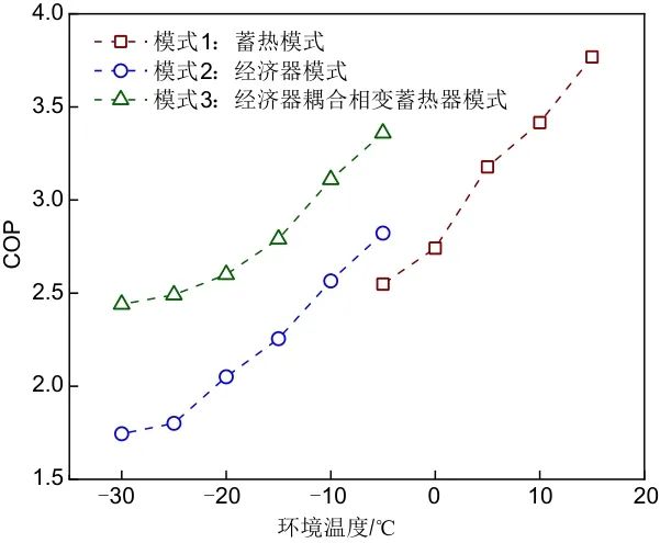 圖6 不同運(yùn)行模式下COP隨環(huán)境溫度的變化