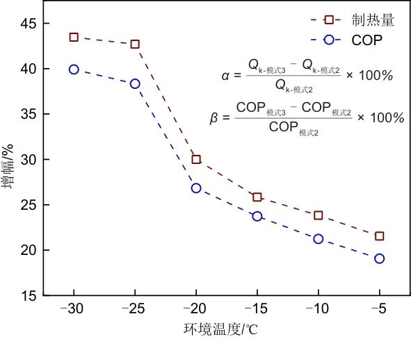 為了進(jìn)一步比較模式2和模式3的系統(tǒng)制熱量和COP的大小,以模式2作為基準(zhǔn)采用相對(duì)增幅來說明此問題,制熱量相對(duì)增幅()與COP相對(duì)增幅(β)的表達(dá)式如下: