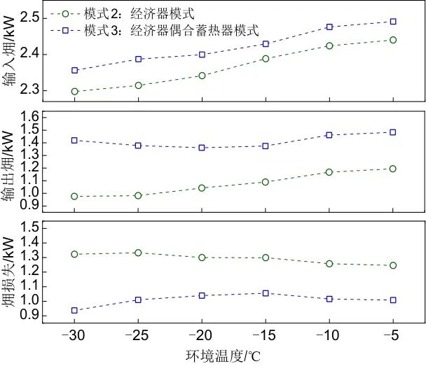 (3)制冷劑的流量隨著環(huán)境溫度的降低而減小,造成?損的增加以及?效率的降低。在模式3中,蓄熱器的加入保證了制熱能力和制熱效率的穩(wěn)定性和可靠性,?效率可提升21.6%~41.8%。