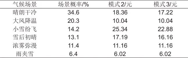 表3給出了居民建筑只采用空氣源熱泵供熱多場(chǎng)景的日運(yùn)行成本。從計(jì)算結(jié)果可以看出在不考慮其他因素時(shí)采用經(jīng)濟(jì)器耦合相變蓄熱器(即準(zhǔn)二級(jí)壓縮耦合儲(chǔ)能裝置)的空氣源熱泵在所選建筑供暖運(yùn)行時(shí)的經(jīng)濟(jì)性較高。模式3日運(yùn)行成本費(fèi)用比模式2低4.63元。相變蓄熱器在低溫環(huán)境下可以通過提高制熱量和COP提高系統(tǒng)的經(jīng)濟(jì)性,且供暖場(chǎng)景的平均氣溫越低,模式3的經(jīng)濟(jì)性優(yōu)勢(shì)比模式2越大,在氣溫最低的小雪紛飛場(chǎng)景中模式3相比模式2的日運(yùn)行成本低11%。