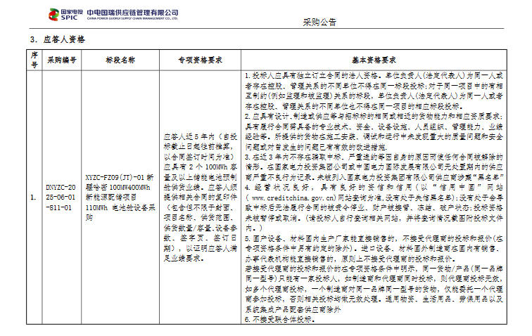 要求應答人近5年內(nèi)應具有2個100MWh容量及以上儲能電池預制艙供貨業(yè)績。