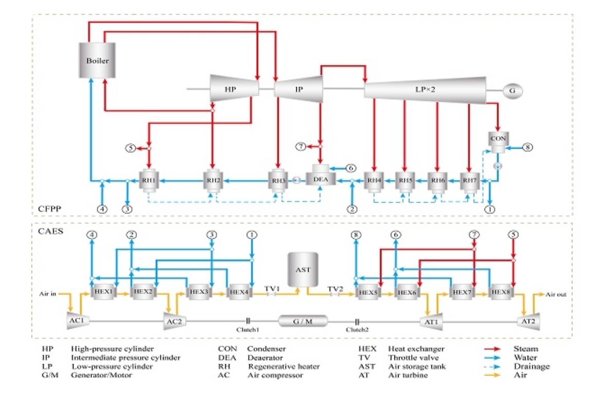 在新型電力系統(tǒng)轉(zhuǎn)型背景下,燃煤電廠作為重要的調(diào)節(jié)性資源,面臨著更高的調(diào)峰深度要求,以及低負(fù)荷運(yùn)行時(shí)易發(fā)生脫硝系統(tǒng)失效、系統(tǒng)能耗增加等行業(yè)亟待解決的重要問題。本研究開發(fā)了一套適用于新一代煤電的物理儲能耦合系統(tǒng),創(chuàng)新性地將物理儲能余熱應(yīng)用到提升脫硝系統(tǒng)工作溫度的場景中,通過雙級壓縮和膨脹工藝優(yōu)化實(shí)現(xiàn)高效能量轉(zhuǎn)化。同時(shí),該技術(shù)有效解決了物理儲能系統(tǒng)充放電過程熱利用平衡問題和燃煤電廠低負(fù)荷下運(yùn)行脫硝系統(tǒng)低溫失效問題,耦合系統(tǒng)的儲能循環(huán)往返效率高達(dá)85.1%,相較于獨(dú)立運(yùn)行物理儲能系統(tǒng)效率提升了13.5%,度電成本降低了23%,顯著提高了鍋爐脫硝系統(tǒng)在低負(fù)荷下的工作溫度和運(yùn)行可靠性。