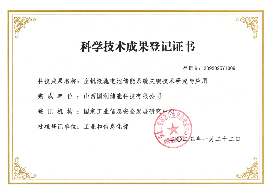 經(jīng)認證報告評定,國潤儲能全釩液流電池儲能系統(tǒng)整體技術(shù)水平達到國內(nèi)領(lǐng)先,各項關(guān)鍵指標(biāo)及技術(shù)達到國際先進水平。對開發(fā)商用釩液流電池的應(yīng)用起到了支撐作用。經(jīng)濟、社會效益顯著,應(yīng)用前景廣闊。