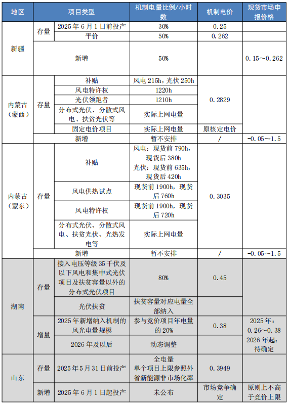 截至2025年6月末,四川、云南、廣西、陜西四省相繼啟動(dòng)了新能源發(fā)電成本調(diào)研工作,山東發(fā)布了新能源電價(jià)市場(chǎng)化改革的征求意見稿,湖南新能源市場(chǎng)化改革的暫行方案已于6月1日開始執(zhí)行,新疆、內(nèi)蒙古(含蒙東、蒙西)發(fā)布了本地區(qū)新能源可持續(xù)發(fā)展價(jià)格結(jié)算機(jī)制的正式方案,各地推動(dòng)新能源市場(chǎng)化步伐明顯加快。