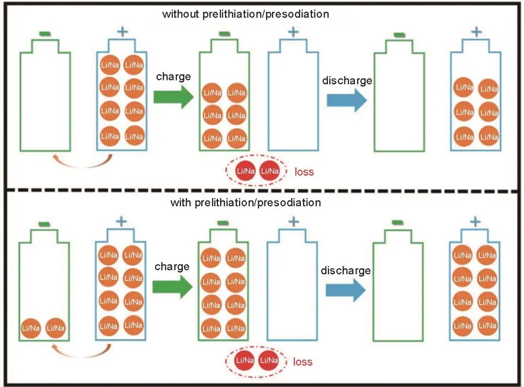 預鈉化技術的原理是通過在負極或正極中預先添加額外的活性鈉,來補償首圈充放電過程中的不可逆容量損失,實現(xiàn)全電池能量密度及循環(huán)壽命的大幅提升。如圖2所示,在放電過程中,由于SEI膜的形成以及界面副反應,和缺陷和官能團的“陷阱效應”,導致了鈉離子的不可逆損失。預鈉化技術是預先添加額外的鈉離子,以減輕在初次充電過程中鈉離子的不可逆損失對電池的能量密度和工作電壓的影響。