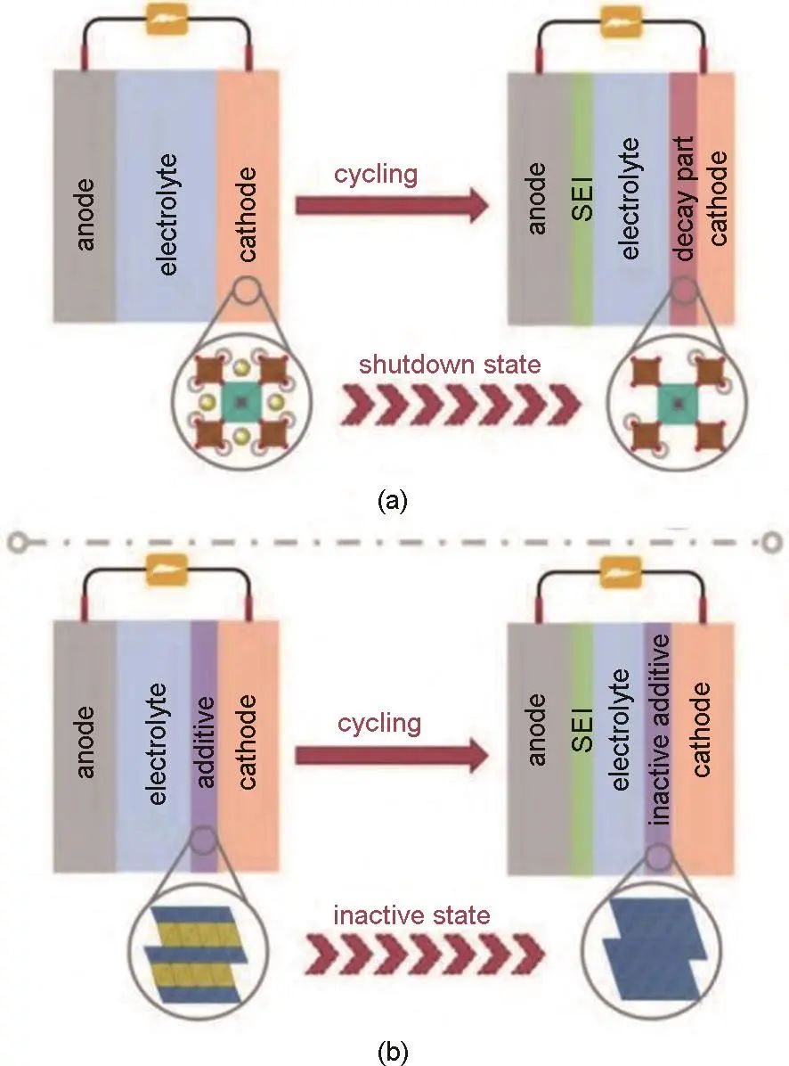圖5 電池循環(huán)示意圖 (a) 常規(guī)電池;(b) 加入正極添加劑的電池