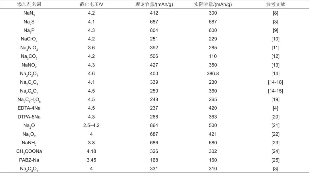 綜上所述,理想的正極補鈉劑應具備以下特點:①含鈉量高,能釋放出更多的活性鈉離子來補償不可逆鈉損失,提高預鈉化效率;②副產(chǎn)物不影響電池性能;③脫鈉電位低于全電池的工作電位,使得電池中添加劑能夠被完全電化學氧化;④應足夠穩(wěn)定,并與當前工藝兼容,實現(xiàn)商業(yè)化生產(chǎn);⑤成本低廉且環(huán)境友好。然而,正極補鈉劑目前尚未完成商業(yè)化推廣,主要由于添加劑發(fā)揮作用后殘留物與少部分添加劑會釋放氣體,影響電池的安全性和穩(wěn)定性,需要對補鈉劑工作機理與作用過程開展更加深入的研究,為補鈉添加劑的商業(yè)化推廣鋪平道路。