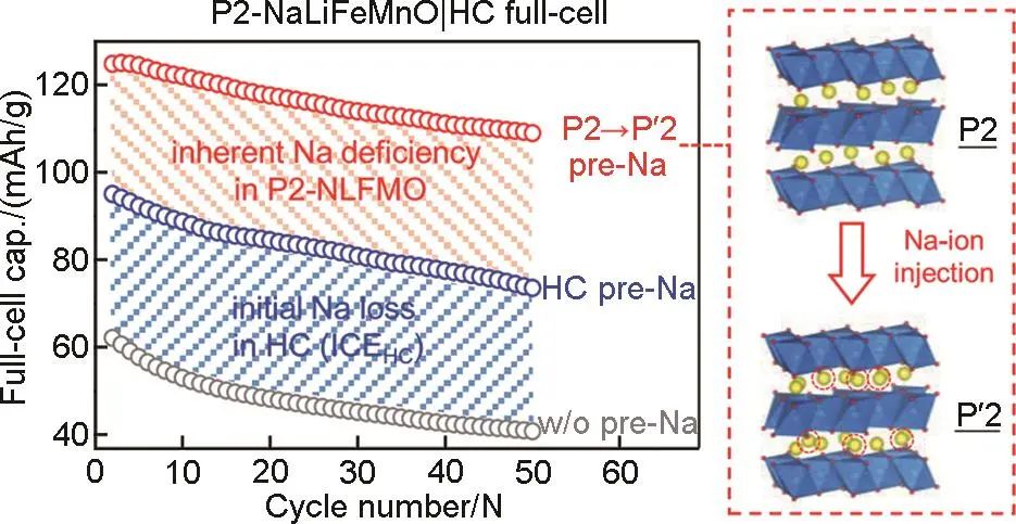 通過電化學的手段獲得富鈉正極,同樣可以有效補償全電池中的活性鈉損失(圖6)。Kai等提出了一種正極預氧化途徑來補償鈉離子全電池的初始鈉離子的不可逆損失,從而使電池獲得更高的比容量和能量密度。將Na//NLFMO半電池放電到1.5 V,將過量的活性鈉注入P2Na0.67Li0.1Fe0.37Mn0.53O2(N0.67LFMO)中,通過電化學預滲法獲得P'2型N0.99LFMO,以補償負極中的鈉損失和NLFMO的鈉缺乏。當活性鈉注入后,NLFMO正極結構由P2變?yōu)镻'2,對后續(xù)循環(huán)無任何影響,HC//NLFMO全電池的比容量為125 mAh/g,而未進行電化學預鈉化的HC//NLFMO全電池比容量只有61 mAh/g,結果可以明顯看出進行電化學預鈉化后的比容量約是常規(guī)電池的2倍。