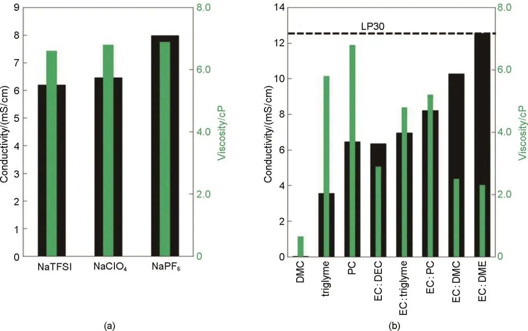 Ponrouch等對不同電解液進行了比較,研究含有不同鈉鹽的配方(NaClO4、NaPF6和NaTFSI)和溶劑(PC、EC、DMC、DME、DEC、THF和三甘醇二甲醚)或溶劑混合物(EC∶DMC、EC∶DME、EC∶PC和EC∶三甘醇二甲醚)的鈉離子電池的黏度、離子電導率和電化學和熱穩(wěn)定性。通過固定鈉鹽(NaClO4)和改變?nèi)軇┓N類,發(fā)現(xiàn)溶劑離子電導率大小(圖7)比為:EC∶DME > EC∶DMC > EC∶PC > EC∶triglyme > EC∶DEC > PC > triglyme >>> DME, DMC, DEC。