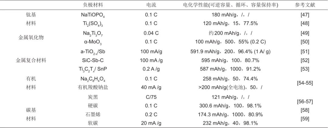 出于鈉離子吸附和脫嵌反應的需要,通常采用具有合適晶格間距的硬碳作為鈉離子電池的負極。然而,硬碳較低的首效也是造成鈉電全電池ICE低的主要原因。從鈉離子全電池的角度來看,負極材料對電池性能起重要作用。常見的負極材料包括:鈦基材料、金屬氧化物、金屬復合材料、有機材料、碳基材料等。Liu等總結了鈦基材料、金屬氧化物、金屬復合材料、有機材料、碳基材料這幾種材料的電化學性能,見表2。