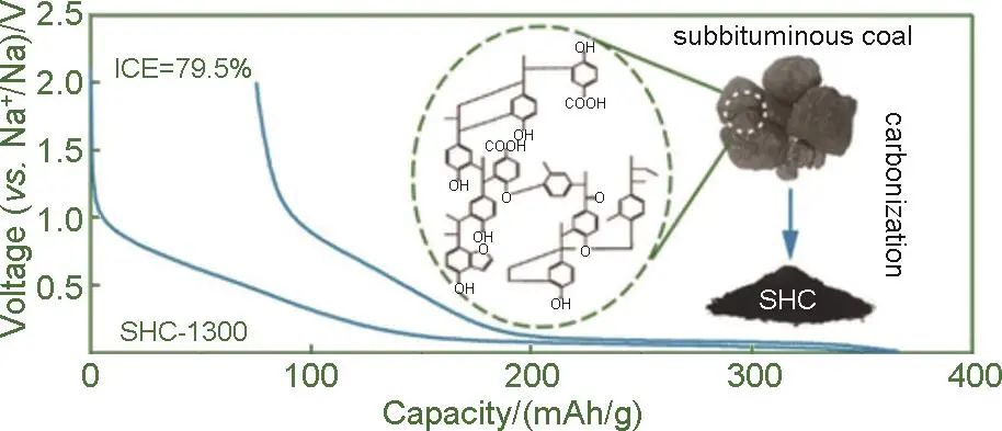 硬碳負極具有諸多優(yōu)點,而其在倍率和循環(huán)性能方面仍有很大的提升空間。因此,對硬碳負極進行優(yōu)化也是補鈉的一條路徑。Lu等報道了一種從次煙煤中裂解出的高容量硬碳作為鈉離子電池的負極。只需通過簡單的一步炭化工藝,就能制備出一種低成本、高容量的鈉離子電池負極材料。通過熱解的亞瀝青碳,得到的SHC-1300負極在20 ℃時儲鈉能力高達291 mAh/g,初始庫侖效率達到79.5%(圖13),并且循環(huán)性能穩(wěn)定。