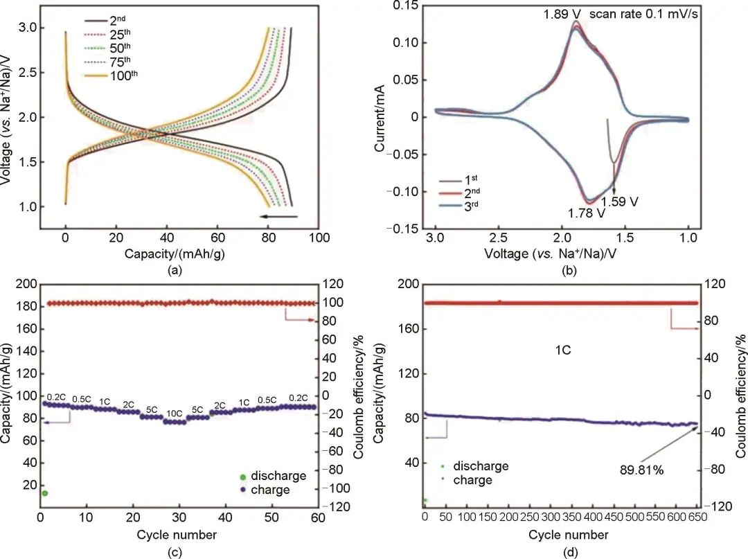 圖14 (a) NaFe0.5Ti0.5O2的放充電循環(huán)曲線,(b) CV 曲線,(c) 倍率性能,(d) 1C倍率長循環(huán)