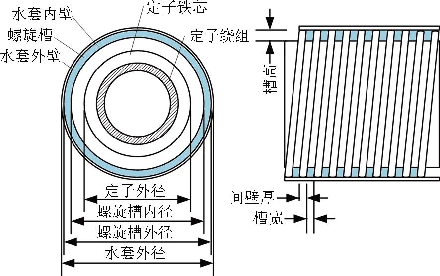 傳統(tǒng)的冷卻方式有風(fēng)冷、液冷和混合冷卻。飛輪儲(chǔ)能系統(tǒng)用電機(jī)的功率密度大,需要處于真空環(huán)境,對(duì)空間限制較為寬松。風(fēng)冷換熱能力有限,且需要建立內(nèi)部流道、破壞真空環(huán)境,因此并不適用。液冷通過(guò)在電機(jī)定子或外殼設(shè)置密封循環(huán)流道,不影響轉(zhuǎn)子的真空環(huán)境,換熱能力強(qiáng),經(jīng)濟(jì)實(shí)用,非常適用于飛輪儲(chǔ)能系統(tǒng)用電機(jī)定子的冷卻。針對(duì)電機(jī)定子水套冷卻的設(shè)計(jì),常用三種計(jì)算方法,簡(jiǎn)化公式法、等效熱網(wǎng)絡(luò)法和數(shù)值計(jì)算法。簡(jiǎn)化公式法通過(guò)熱平衡計(jì)算得到相應(yīng)溫升及設(shè)計(jì)參數(shù),計(jì)算簡(jiǎn)便且理論性強(qiáng),但需要進(jìn)一步校核和檢驗(yàn)。等效熱路法利用集總參數(shù)法等效各部分的熱源及熱阻,并建立熱網(wǎng)絡(luò),其計(jì)算精度適中,取決于網(wǎng)絡(luò)節(jié)點(diǎn)數(shù)量。數(shù)值解法通過(guò)建立詳細(xì)的計(jì)算模型并求解流體的流動(dòng)傳熱獲得定子的溫度分布,精度高,目前使用較多,但計(jì)算復(fù)雜且消耗計(jì)算資源大、計(jì)算時(shí)間長(zhǎng)。目前缺乏一種簡(jiǎn)單快捷的設(shè)計(jì)方法,能夠快速對(duì)電機(jī)定子水套冷卻開(kāi)展設(shè)計(jì)并進(jìn)一步校核和檢驗(yàn)。