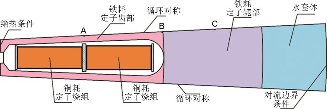 電機(jī)定子銅耗、定子齒部和軛部的鐵耗不同,分別設(shè)置不同的內(nèi)熱源。由于電機(jī)轉(zhuǎn)子另外設(shè)計(jì)了散熱,其溫度不高,且電機(jī)整體處于真空環(huán)境下,風(fēng)損很小,靠近轉(zhuǎn)子部分的定子齒部設(shè)置了絕熱條件。在定子軛部外側(cè)設(shè)置了水套體,使用公式(8)得到的等效對(duì)流換熱系數(shù),在水套體外側(cè)設(shè)置對(duì)流邊界條件以考慮定子水套冷卻,相關(guān)設(shè)置見(jiàn)圖3。