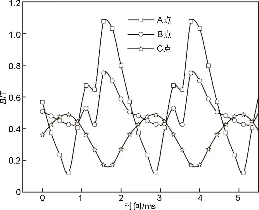 通過(guò)時(shí)步有限元對(duì)電機(jī)鐵芯磁場(chǎng)的數(shù)值計(jì)算,在4500 r/min下得到定子鐵芯在齒身中部A點(diǎn)、齒跟中部B點(diǎn)和軛部中部C點(diǎn)磁密變化波形(見(jiàn)圖4)??梢钥吹剑X身中部、齒根中部和軛部中部的最大磁密依次減小,約為1.08 T、0.75 T和0.49 T,綜合齒部和軛部的磁密分布情況,得到定子齒部和軛部損耗分別是1.51 kW和1.67 kW,以此設(shè)置定子齒部和軛部的內(nèi)熱源qv