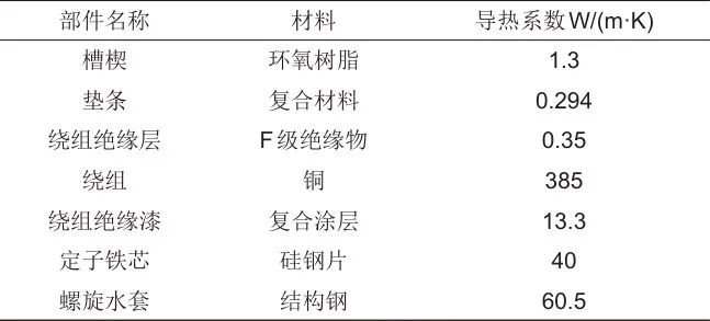 計(jì)算過(guò)程主要用到的材料包括環(huán)氧樹(shù)脂、復(fù)合材料、F級(jí)絕緣材料、銅和硅鋼片等,相關(guān)材料的導(dǎo)熱系數(shù)如表2所示。