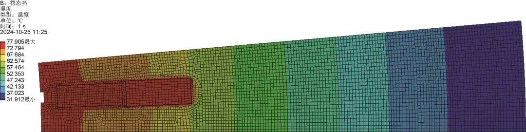 取槽道高0.04 m、槽道寬0.03 m、螺距0.047 m、槽道壁厚0.017 m,設(shè)計(jì)溫升3 ℃,電機(jī)轉(zhuǎn)速為4500 r/min,冷卻水進(jìn)口溫度30 ℃,計(jì)算定子的溫度分布,結(jié)果如圖6所示。沿著徑向方向,定子的溫度越來(lái)越低,熱量被最外側(cè)的冷卻水帶走。在更靠近轉(zhuǎn)子的定子繞組處取得最高溫度約77.91 ℃。