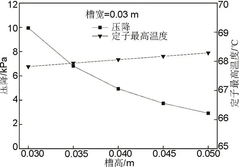 根據(jù)公式(10)可得所用螺旋水套的摩擦阻力。如圖7所示,在槽寬0.03 m時(shí),隨著槽高的增大,計(jì)算得到的壓降逐漸減小,定子最高溫度升高。在槽寬0.03 m時(shí),壓降為10.0 kPa,定子最高溫度為67.82 ℃,槽寬為0.05 m時(shí),壓降降低到2.9 kPa,定子最高溫度升高為68.30 ℃。