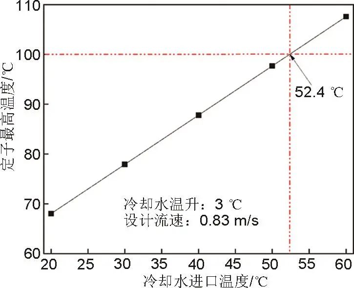 在電機(jī)最大熱損耗下,為滿(mǎn)足定子最高溫度小于100 ℃,冷卻水設(shè)計(jì)溫升與冷卻水最高進(jìn)口溫度的關(guān)系如圖10所示??梢钥吹?,隨著冷卻水設(shè)計(jì)溫升的增大,冷卻水最高進(jìn)口溫度逐漸減小,近似呈線性。冷卻水設(shè)計(jì)溫升從2 ℃提高到6 ℃,流量降低,冷卻水進(jìn)口溫度需從52.8 ℃降低至51.1 ℃。