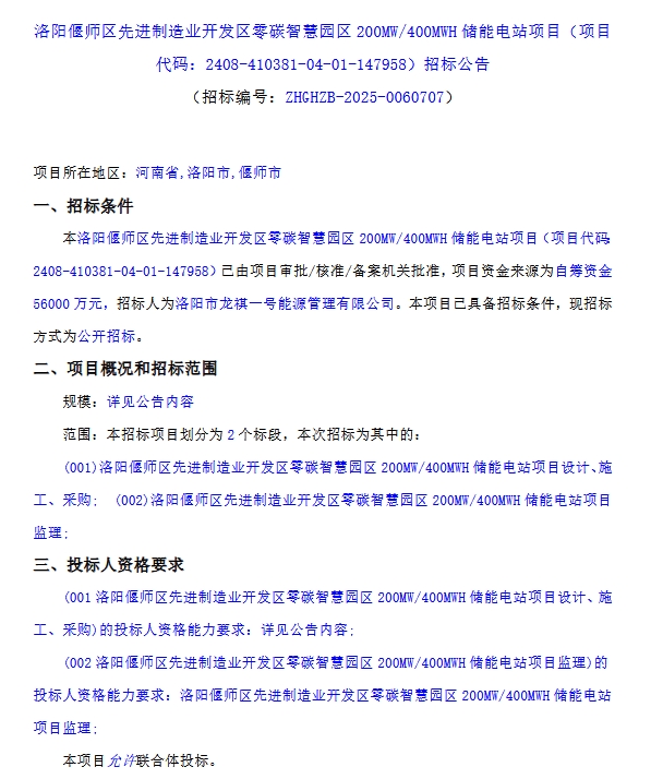 中國儲能網(wǎng)訊:7月7日,洛陽市龍祺一號能源管理有限公司發(fā)布洛陽偃師區(qū)先進制造業(yè)開發(fā)區(qū)零碳智慧園區(qū)200MW/400MWh儲能電站項目招標(biāo)公告。項目位于河南省洛陽市偃師市,一標(biāo)段招EPC總承包,最高投標(biāo)限價55900萬元,折合單價1.398元/Wh,二標(biāo)段招監(jiān)理。