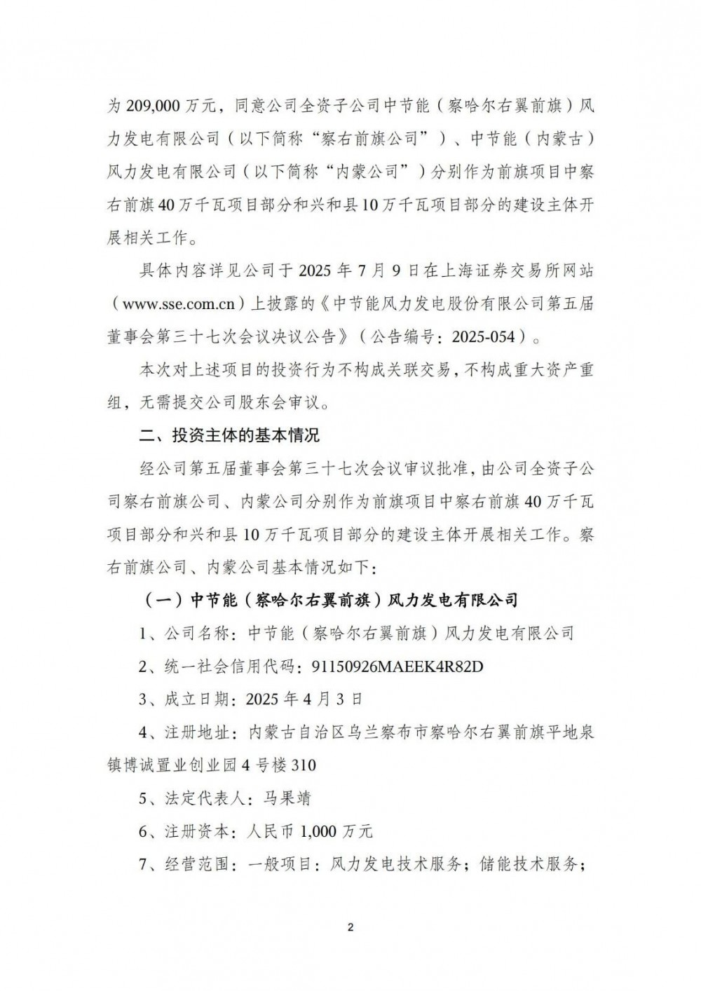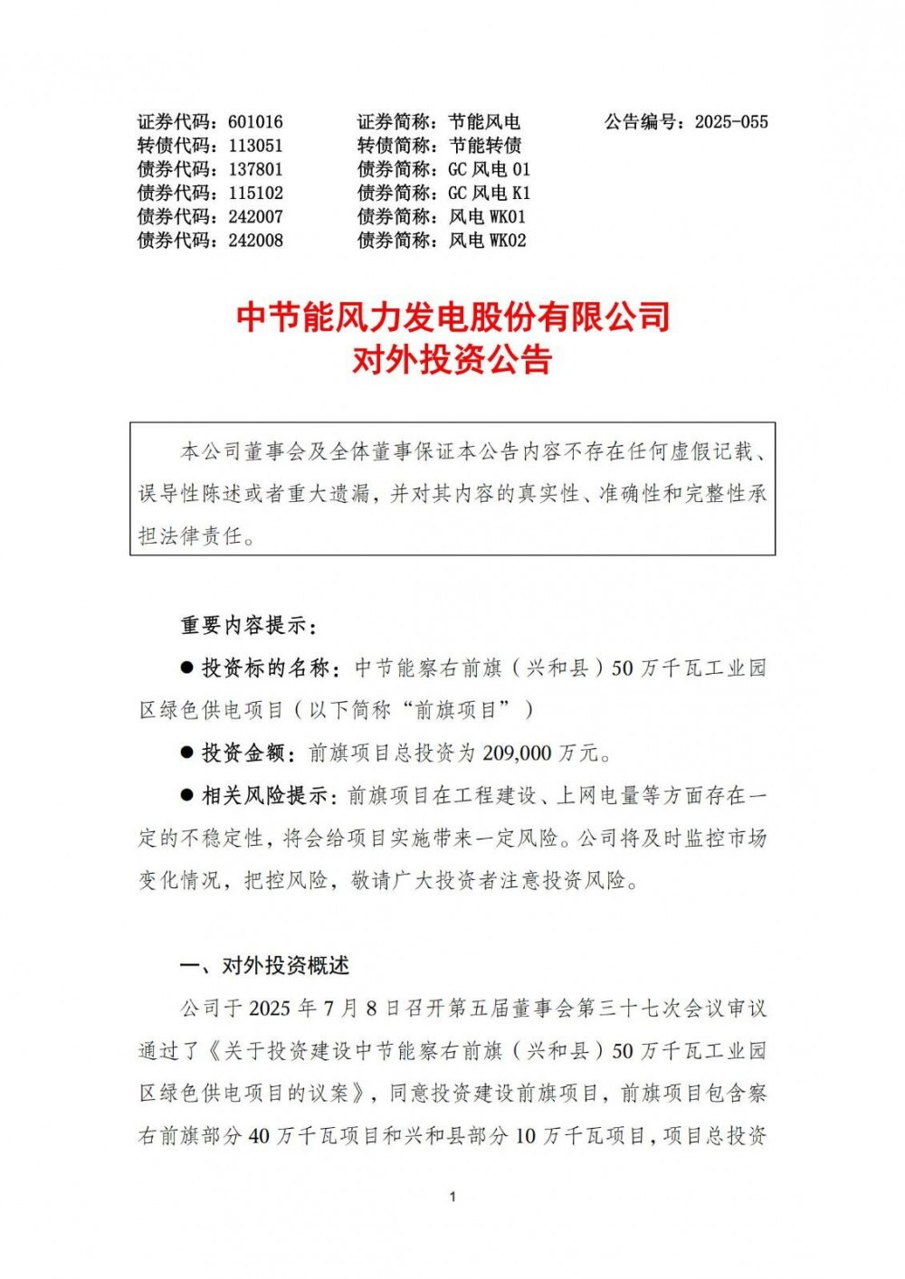 中國儲能網(wǎng)訊:7月8日,節(jié)能風電發(fā)布公告稱,擬投資中節(jié)能察右前旗(興和縣)50萬千瓦工業(yè)園區(qū)綠色供電項目,項目總投資為209,000萬元。其全資子公司中節(jié)能(察哈爾右翼前旗)風力發(fā)電有限公司、中節(jié)能(內(nèi)蒙古)風力發(fā)電有限公司分別作為前旗項目中察右前旗40萬千瓦項目部分和興和縣10萬千瓦項目部分的建設主體開展相關工作。