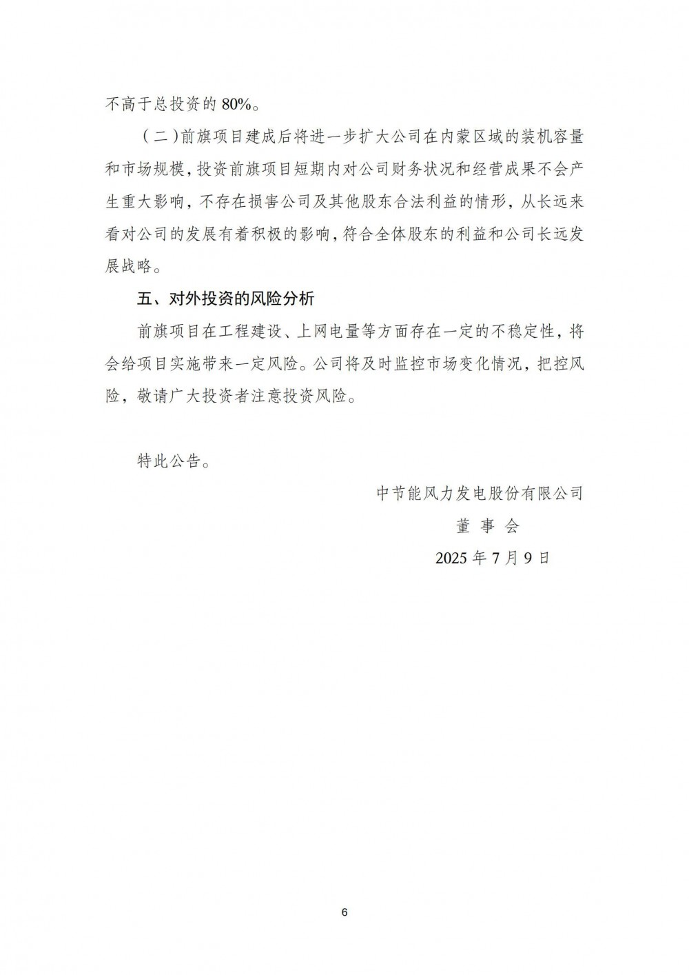 節(jié)能風電表示,前旗項目建成后將進一步擴大公司在內(nèi)蒙區(qū)域的裝機容量和市場規(guī)模,投資前旗項目短期內(nèi)對公司財務狀況和經(jīng)營成果不會產(chǎn)生重大影響,不存在損害公司及其他股東合法利益的情形,從長遠來看對公司的發(fā)展有著積極的影響,符合全體股東的利益和公司長遠發(fā)展戰(zhàn)略。