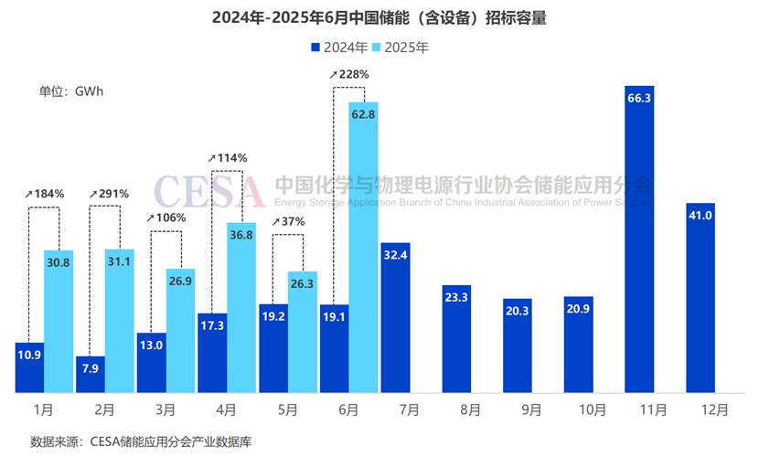 6月儲(chǔ)能招投標(biāo)市場(chǎng)依舊火爆。據(jù)CESA儲(chǔ)能應(yīng)用分會(huì)產(chǎn)業(yè)數(shù)據(jù)庫不完全統(tǒng)計(jì),2025年6月儲(chǔ)能項(xiàng)目(含直流側(cè)設(shè)備采購)公開招標(biāo)規(guī)模高達(dá)21.7GW/62.8GWh,招標(biāo)容量同比增長228%,創(chuàng)2025年以來新高。