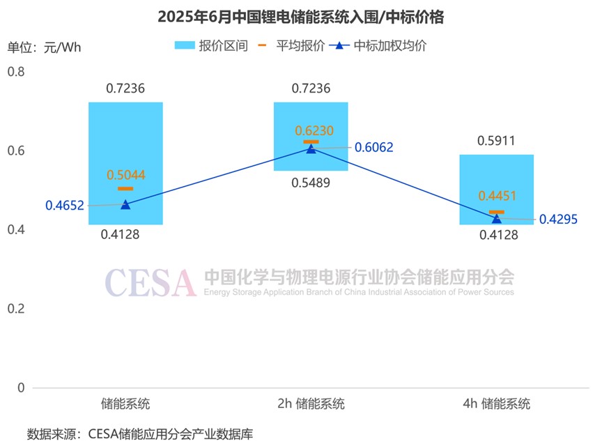 2025年6月,鋰電儲(chǔ)能系統(tǒng)(不含工商儲(chǔ))入圍報(bào)價(jià)主要集中在0.4128-0.7236元/Wh,平均價(jià)格0.5044元/Wh,中標(biāo)加權(quán)均價(jià)0.4652元/Wh。
