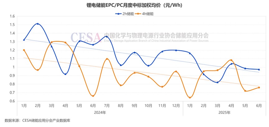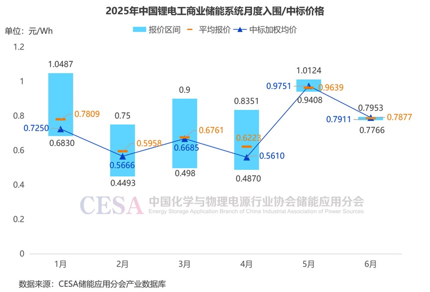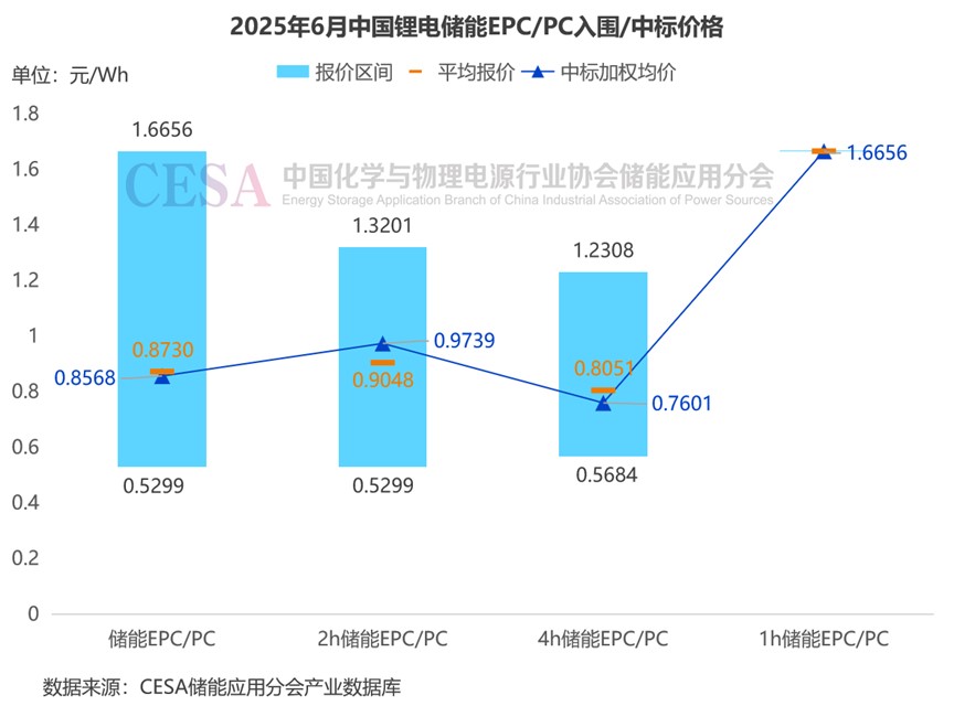 2025年6月,鋰電儲(chǔ)能EPC/PC(不含工商儲(chǔ)、固態(tài)電池儲(chǔ)能)入圍報(bào)價(jià)主要集中在0.5299-1.6656元/Wh,平均報(bào)價(jià)0.873元/Wh,中標(biāo)加權(quán)均價(jià)0.8568元/Wh。