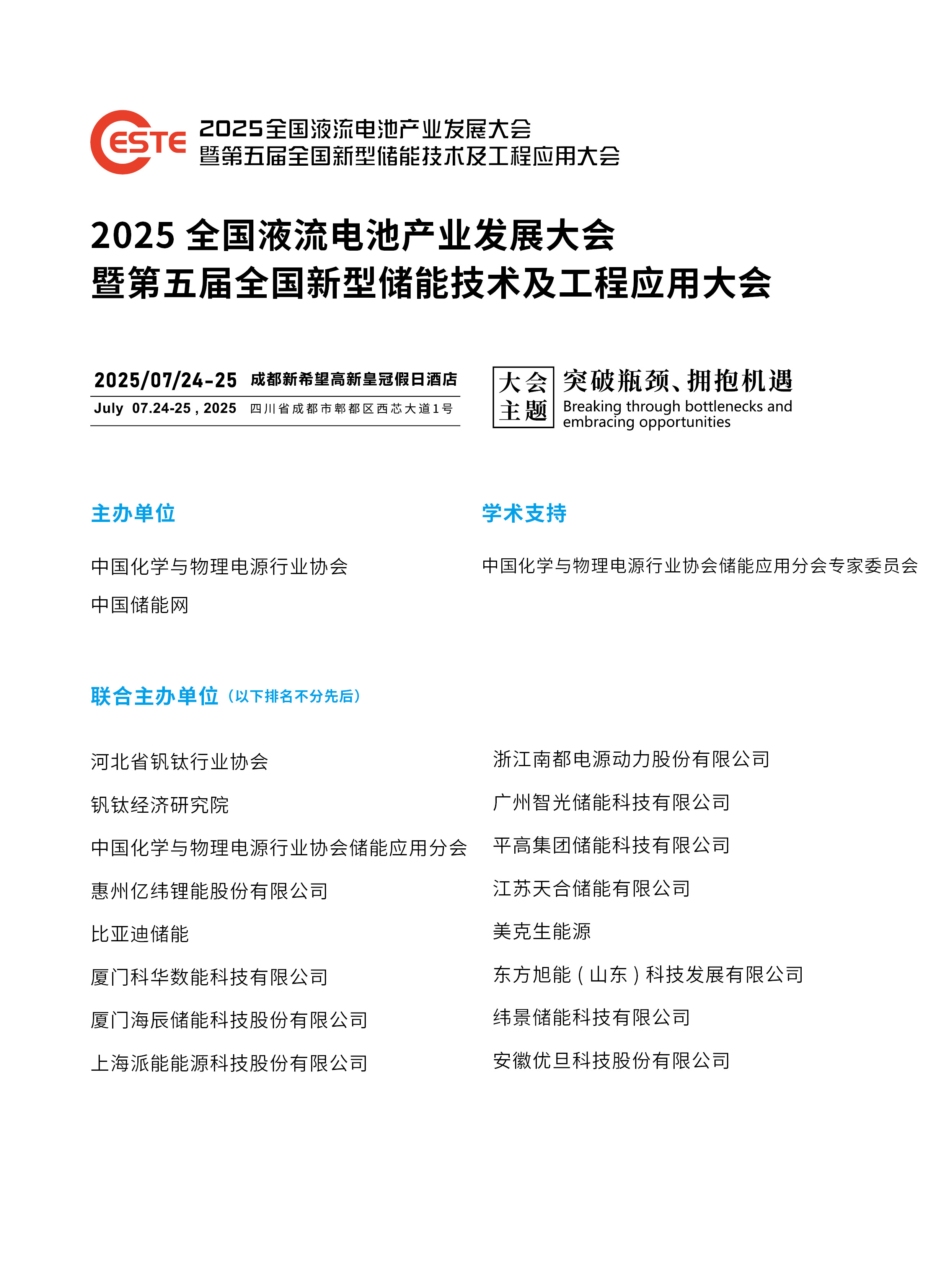 中國(guó)儲(chǔ)能網(wǎng)訊:由中國(guó)化學(xué)與物理電源行業(yè)協(xié)會(huì)聯(lián)合河北省釩鈦行業(yè)協(xié)會(huì)等主辦的2025全國(guó)液流電池產(chǎn)業(yè)發(fā)展大會(huì)暨第五屆全國(guó)新型儲(chǔ)能技術(shù)及工程應(yīng)用大會(huì),將定于7月23日-25日在成都召開(kāi)。會(huì)議同期召開(kāi)第六屆全國(guó)工商業(yè)儲(chǔ)能產(chǎn)業(yè)發(fā)展研討會(huì)和液流電池產(chǎn)業(yè)高端閉門(mén)會(huì)。