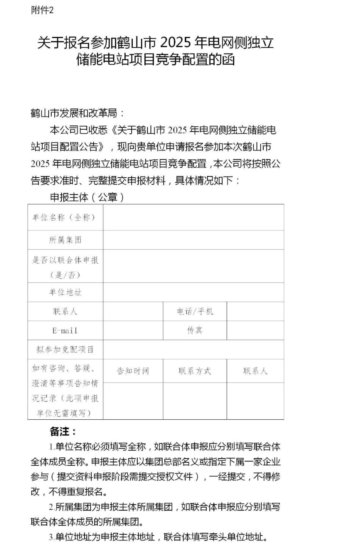 牽頭主體或聯(lián)合體主體提交參加鶴山市2025年電網(wǎng)側(cè)獨立儲能電站競爭配置的函。