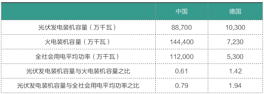 相比之下,截至2024年底,德國的光伏發(fā)電裝機容量約為1.03億千瓦,火電裝機容量約為7230萬千瓦,全社會用電平均負荷為5300萬千瓦。光伏發(fā)電裝機容量約為火電裝機容量的142%,為全社會用電平均功率的194%。