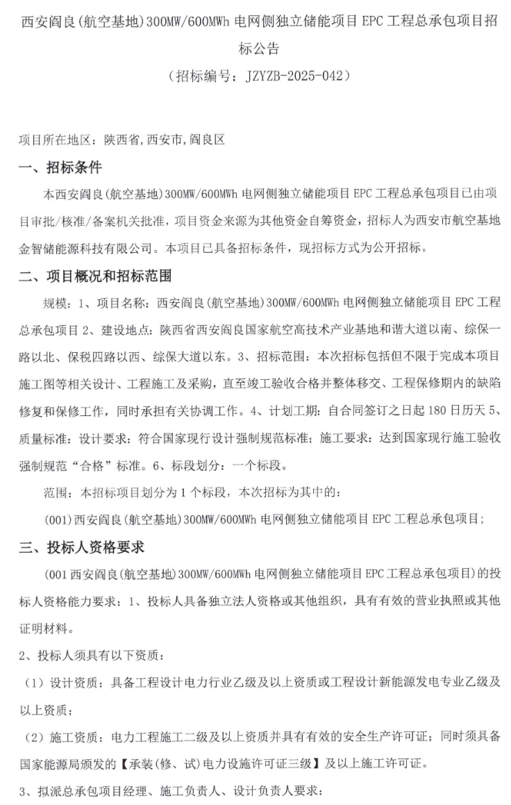 中國儲能網(wǎng)訊:7月14日,西安閻良(航空基地)300MW/600MWh電網(wǎng)側(cè)獨(dú)立儲能項(xiàng)目EPC工程總承包項(xiàng)目招標(biāo)公告發(fā)布,招標(biāo)人為西安市航空基地金智儲能源科技有限公司。