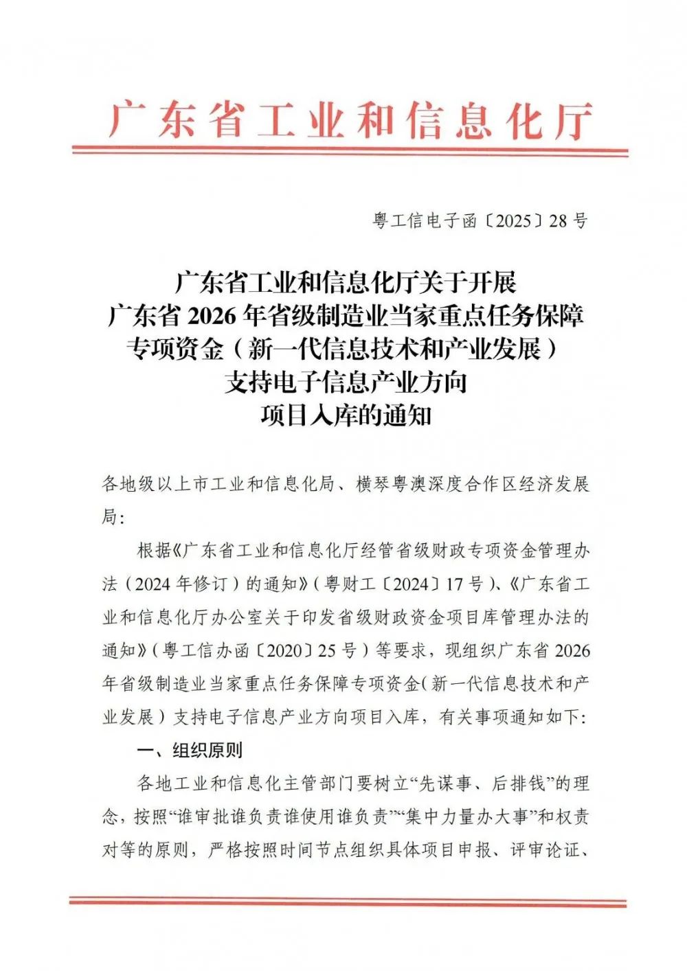 現(xiàn)將《廣東省工業(yè)和信息化廳關(guān)于開展廣東省2026年省級制造業(yè)當家重點任務保障專項資金(新一代信息技術(shù)產(chǎn)業(yè)發(fā)展)支持電子信息產(chǎn)業(yè)方向項目通知》(粵工信電子函〔2025〕28號)轉(zhuǎn)發(fā)給你們,為做好我市項目入庫申報工作,有關(guān)事項通知如下: