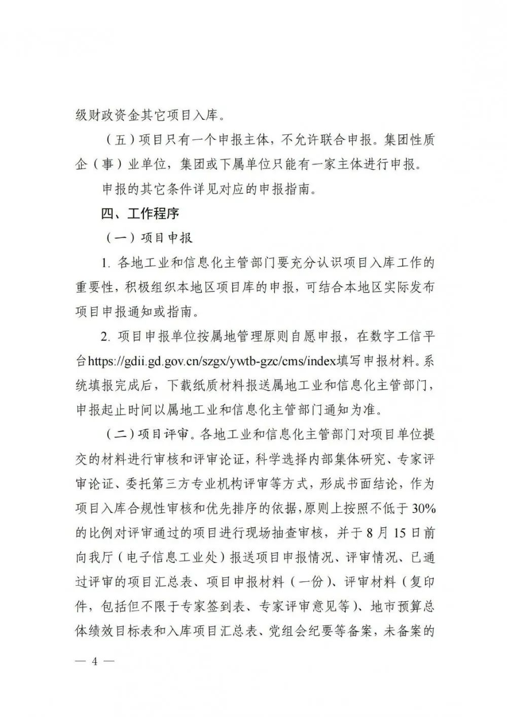 (一)項目申報。項目申報單位按屬地管理原則自愿申報,在數(shù)字工信平臺(https://gdii.gd.gov.cn/szgx/ywtb-gzc/cms/index)填寫申報材料。系統(tǒng)填報完成后,下載紙質(zhì)材料報送屬地區(qū)(縣)工業(yè)和信息化主管部門。
