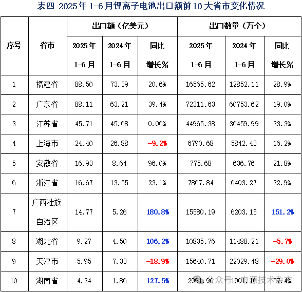 2025年1-6月福建省仍是我國鋰離子電池出口產(chǎn)品的最大來源地,出口金額為88.5億美元,同比增長20.6%,占我國鋰離子電池出口額的26%;出口數(shù)量為1.66億個,同比增長28.9%。廣東省位居第二,出口金額為88.11億美元,同比增加39.4%,占我國鋰離子電池出口額的25.8%;出口數(shù)量7.23億個,同比增長19%。江蘇省排名第三,出口額為45.71億美元,同比增長0.06%,占我國鋰離子電池出口額的13.4%;出口數(shù)量4.5億個,同比增長23.3%。福建、廣東和江蘇三省的鋰離子電池出口額占到全國鋰離子電池出口額的65.2%。