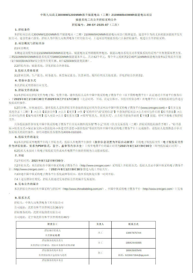 中國(guó)儲(chǔ)能網(wǎng)訊:7月24日,中鐵九局尚義300MW1200MWh獨(dú)立儲(chǔ)能電站(二期)210MW840MWh儲(chǔ)能電站項(xiàng)目?jī)?chǔ)能系統(tǒng)二次公開招標(biāo)采購(gòu)招標(biāo)公告發(fā)布,項(xiàng)目招標(biāo)人為中鐵九局集團(tuán)電務(wù)工程有限公司,建設(shè)單位為尚義縣朗能新能源開發(fā)有限公司,項(xiàng)目位于河北省張家口市。