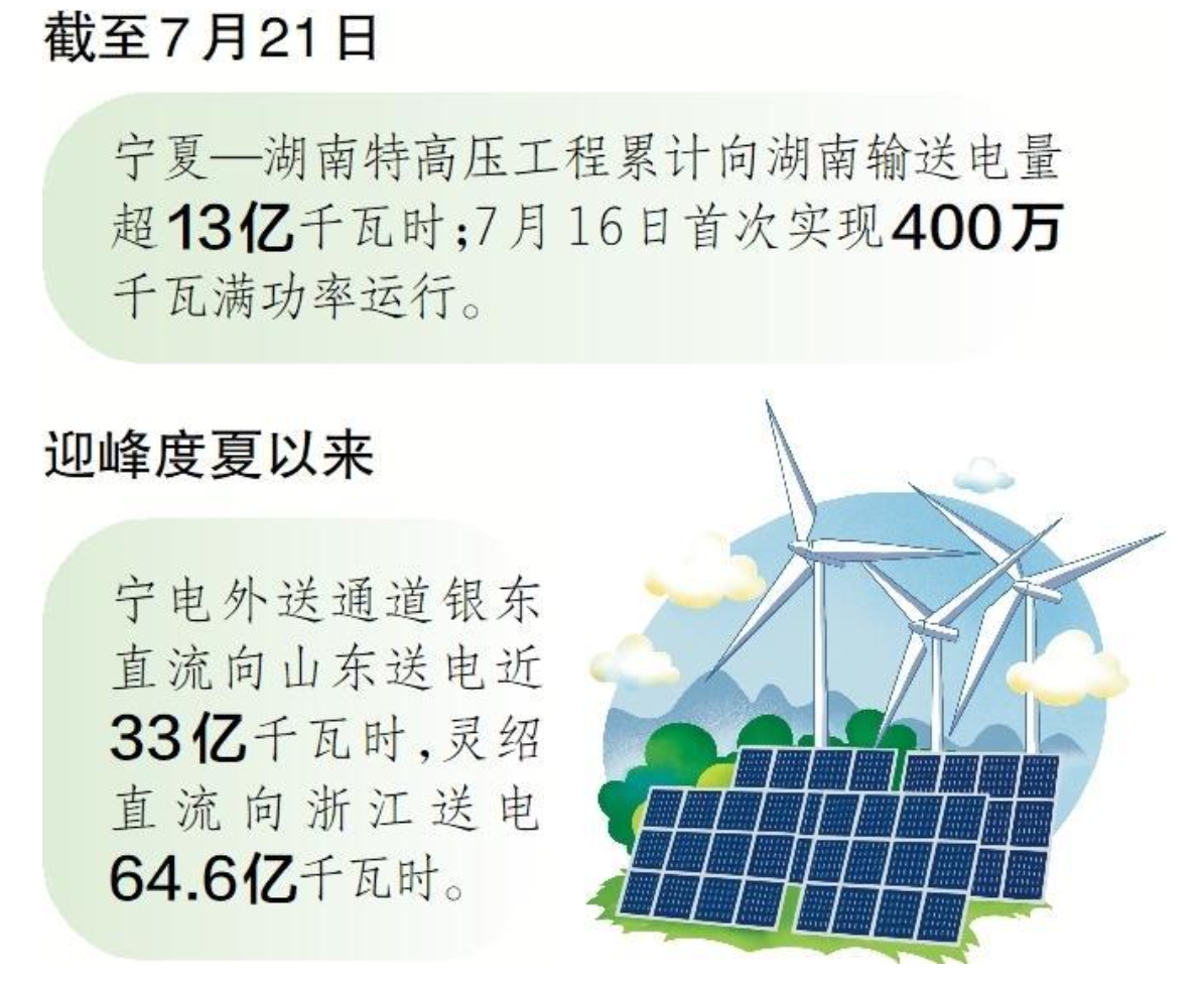 寧夏—湖南特高壓工程是寧夏繼±660千伏銀東直流、±800千伏靈紹直流之后建設的第三條電力外送大通道。通過三條“電力高速路”,寧夏將豐富的風、光、火電打捆送往華中、華北、華東地區(qū)。迎峰度夏以來,銀東直流滿負荷運行時長累計超263小時,向山東送電近33億千瓦時;靈紹直流95%額定功率及以上運行時長累計達44小時,向浙江送電64.6億千瓦時。