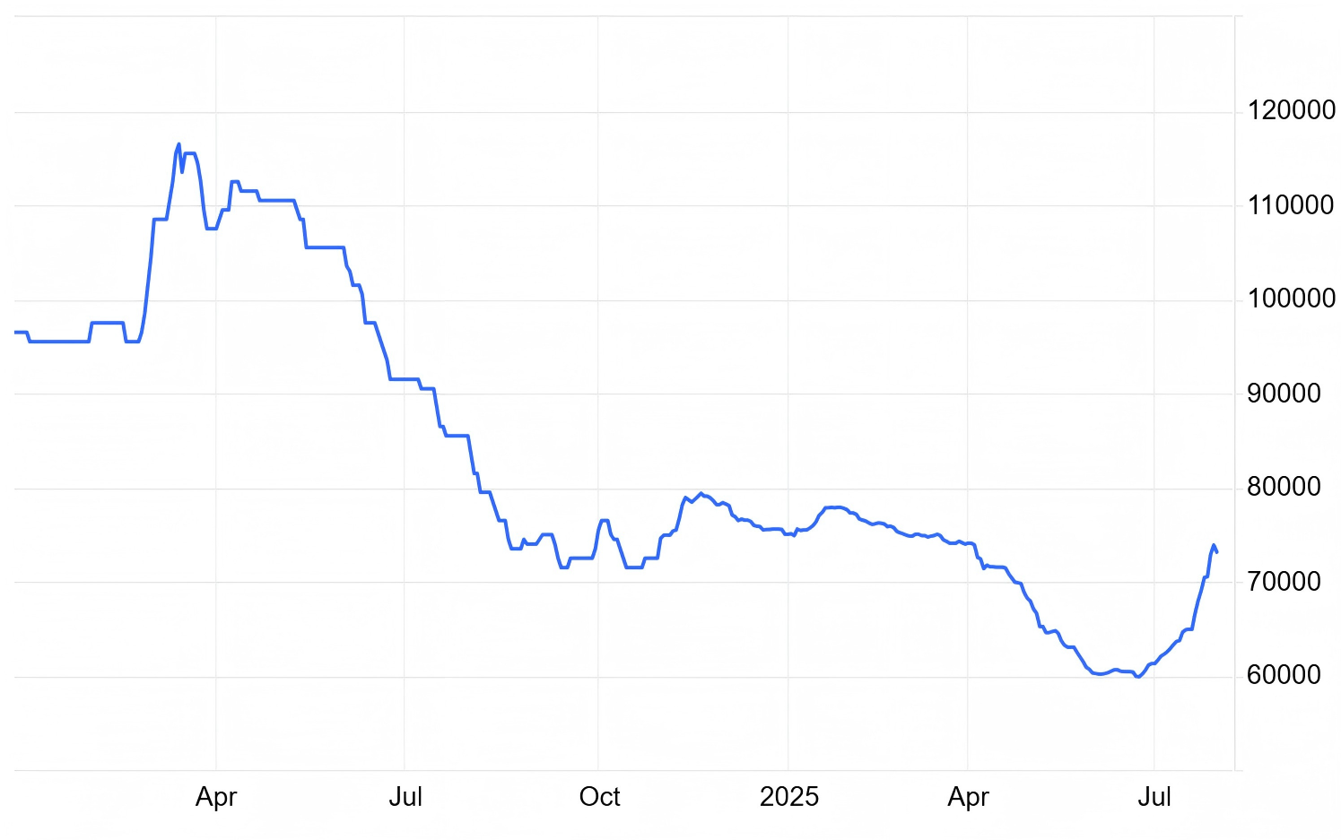 7月25日,廣州期貨交易所碳酸鋰期貨主力合約(LC2509)收盤價達80520元/噸,創(chuàng)5個月以來新高。然而,到了7月28日,主力合約價格又回落至73120元,較7月25日的高點收跌近8%,碳酸鋰價格一下子變成了“過山車”。
