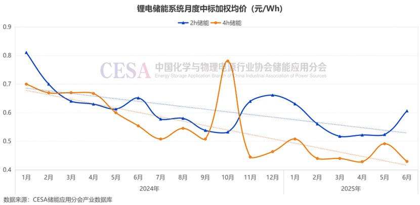 這一系列政策組合拳的出臺有著深刻行業(yè)背景。據(jù)CESA儲能應(yīng)用分會產(chǎn)業(yè)數(shù)據(jù)庫不完全統(tǒng)計,2024年鋰電儲能EPC中標(biāo)均價為1.175元/Wh,同比下降16.07%。2024年鋰電儲能系統(tǒng)中標(biāo)均價0.574元/Wh,同比下降47.82%。2025年1—6月,鋰電儲能EPC/PC中標(biāo)均價0.9618元/Wh,同比下降24.09%。2025年1—6月,鋰電儲能系統(tǒng)中標(biāo)均價0.4848元/Wh,同比下降29.94%。