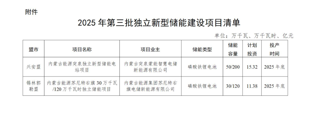 內(nèi)蒙古自治區(qū)能源局關(guān)于印發(fā)2025年第三批獨立新型儲能建設(shè)項目清單的通知