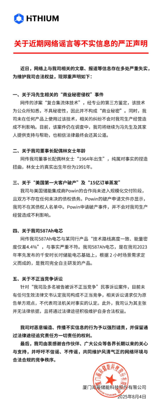 8月4日晚間,海辰儲能通過官方渠道發(fā)布《關(guān)于近期網(wǎng)絡(luò)謠言等不實信息的嚴(yán)正聲明》,針對“商業(yè)秘密侵權(quán)”“美國第一大客戶破產(chǎn)”“不正當(dāng)競爭訴訟”等五大網(wǎng)絡(luò)謠言逐一辟謠,強(qiáng)調(diào)涉案技術(shù)不具秘密性、訂單未受影響,并重申587Ah電芯為自主研發(fā)產(chǎn)品。