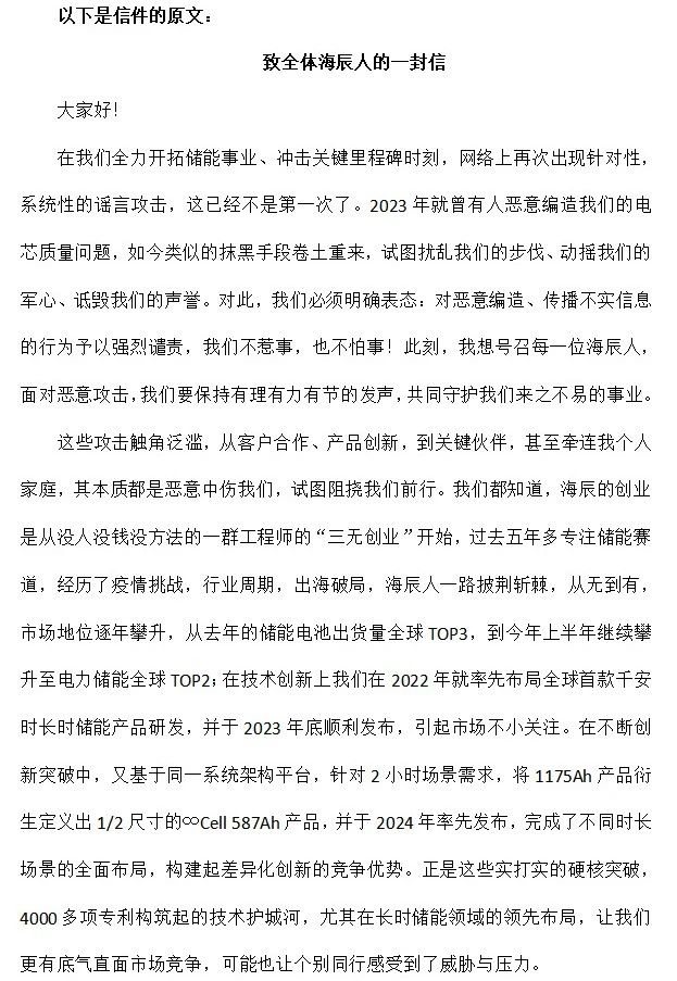 聲明發(fā)布僅24小時后,8月5日晚間,海辰儲能創(chuàng)始人、董事長吳祖鈺(Jeff)向全體員工群發(fā)《致全體海辰人的一封信》,以“我們不惹事,也不怕事”的強(qiáng)硬態(tài)度,回應(yīng)近期輿情攻擊。
